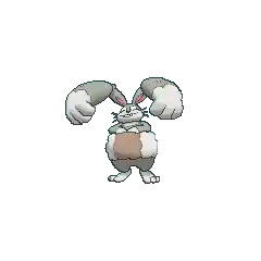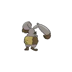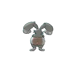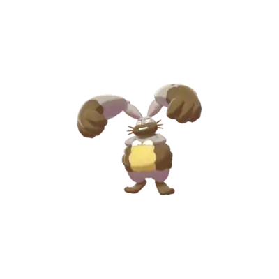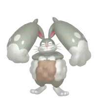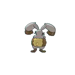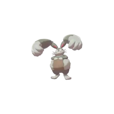 Diggersby is a bipedal Pokémon that resembles a large, portly gray rabbit. Its most notable feature is its two ears, which resemble muscular forearms, complete with three-fingered paws. The ears are mostly gray with pink interiors, whereas the paws at the tips are brown. There are three brown spots above each ear-paw. A pointed protrusion in the middle resembles an elbow. These ears are strong enough to lift objects weighing over a ton and prove to be an invaluable asset in Diggersby's digging.