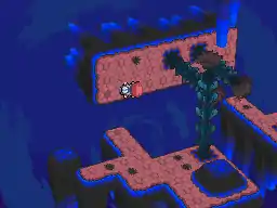 More of the 3D capabilities of the DS are utilized in the Distortion World than elsewhere in Sinnoh. It is a dark place with platforms floating at many different angles. The world disobeys the normal laws of physics, creating an effect similar to the art of M. C. Escher. Time is said to not flow and spatial relations are shown to be irregular, allowing the player to walk and Surf on walls in any direction. Trees and rocks can simply grow out of the ground and then disappear. The player is able to go up a waterfall without having the move Waterfall or the Beacon Badge. This is possibly due to the fact that gravity is not normal in this world; therefore, no extra effort is needed by the Pokémon to climb the waterfall. Also, given how the player appears to be "surfing" on the waterfall's surface, it may be that the waterfall isn't being "climbed" at all. The only Pokémon known to inhabit the Distortion World is Giratina. Therefore, fishing has no results here, showing up with a message that there seems to be no Pokémon in this water.