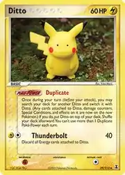 Once during your turn (before your attack), you may search your deck for another Ditto and switch it with Ditto. (Any cards attached to Ditto, damage counters, Special Conditions, and effects on it are now on the new Pokémon.) If you do, put Ditto on top of your deck. Shuffle your deck afterward. You can't use more than 1 Duplicate Poké-Power each turn.