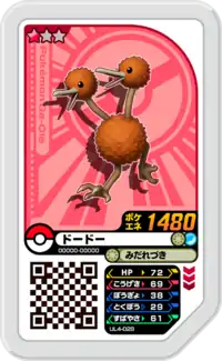 Doduo (Japanese: ドードー Dodo) is a Grade 1 Pokémon Ga-Olé disk. It is part of the fourth Ultra Legend set.