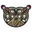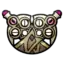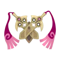 Doublade is a Pokémon composed of two swords. Each sword has a silver blade and a light gray hilt. Embedded in each hilt is a single, pink gem with a dark center that appears to be an eye. Attached to each pummel is a long, dark purple sash with a pink swirl pattern on the tip; the tip of the sashes split into four tassels. Doublade has two sheathes that are attached to a plaque. The sheathes are varying shades of brown with lines forming a triquetra pattern across the front. Near the top of each sheath are white teeth-like markings and rings with white centers that resemble eyes. A third ring extends onto the hilt and encircles the actual eye.