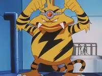 It had a headgear on its head which made it angry, thus making it more powerful. Electabuzz used an enraged Thunder Punch to try to faint Ash's Pikachu and Sparky, but they dodged it. Pikachu tried to use Thunderbolt on its headgear, but it blocked the headgear with Light Screen, and Namba started to make Electabuzz even angrier with the controls he was holding. Pikachu and Sparky continued to fight until Sparky broke the controls, also disabling the headgear. They then finished Electabuzz off with a double Thunder attack. Electabuzz's known moves are Thunder Punch, Light Screen, and Thunderbolt. | ||