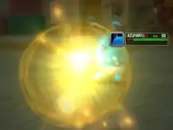 A ball of fire forms in Dragonite's mouth and it releases a fiery inferno to the opponent; or, Dragonite releases a yellow ball of energy from its mouth to the opponent. | ||