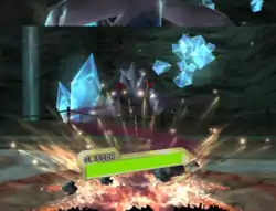 Garchomp flies at the opponent and the two appendages on its head glow light blue. Then, its body becomes enveloped in a light blue aura with the same color streaks and it slams into the opponent, or the appendages on its head glow blue and it releases a dragon-shaped energy that covers its body. It then slams into the opponent with full force. | ||