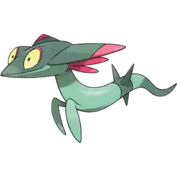 Drakloak is a Pokémon which resembles a lizard, with a wide, black-colored head with two vertical horns and several red triangle-shaped sports on the sides. It has yellow eyes, while the underside of its mouth is light blue. The rest of its body is also light blue, while its belly is yellow with a red, upside-down V-shaped spot. It has short, stubby arms and legs and a long tail.