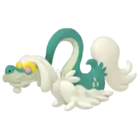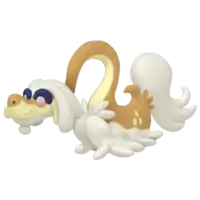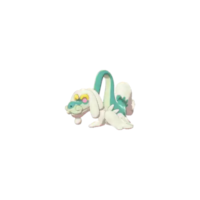 Drampa is a serpentine Pokémon similar to a Chinese dragon. Most of its skin is bluish-green, but the lower half of its face and the underside of its neck is a pale green. There are three spots on each of its sides that are also light green. It has pink eyes with rounded, yellow eyebrows, short whiskers resembling a mustache, floppy ears, and a small, white beard with a circular extension. On top of its head is a mop of white hair split into four rounded sections: two draped down either side of its head. Fluffy white fur drapes the lower half of its body and conceals its arms when they are tucked against its chest. When its arms are spread, two short claws are revealed on each hand. It has a bushy white tail with a small, curved spike at the base.