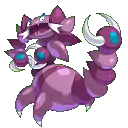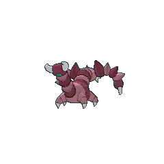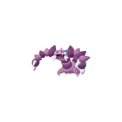 Drapion is a large, purple, scorpion-like Pokémon. Its eyes are a pointed shape, with blue-colored upper portions. Drapion has two small, pointed protrusions between its eyes, and one on the back of its head. Drapion also has protrusions on its jaws, two on the upper and three on the lower, with large, fang-like, white-colored features extending from its mouth. Its body is composed of many violet-to-lavender body segments which ends with a tail with two stingers. Drapion has four segmented legs with pointed toes. Its most distinguishing feature is its huge claws. It can turn its head 180 degrees.