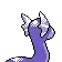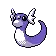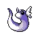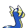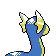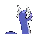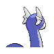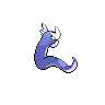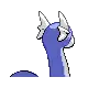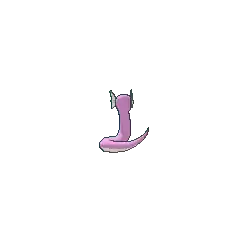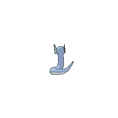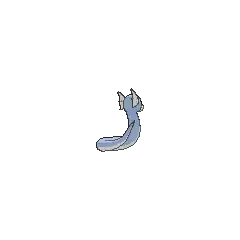 Dratini is a serpentine Pokémon with a blue body and a white underside. It has white, three-pronged fins on the sides of its head and a white bump on its forehead, which is its horn growing. Above its round, white snout are oval, purple eyes.