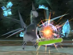| Empoleon's beak and crown glows gold or white and it spins like a drill as it jumps at the opponent, hitting it with its beak; or, Empoleon's crown glows yellow and a white streak of energy swirls arounds its body. It then charges towards the opponent. Sometimes when it charges, it holds out its arms. | |||