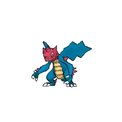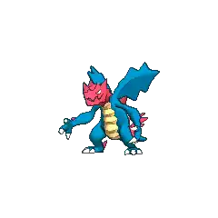 Druddigon is a large, blue, draconic Pokémon with medium-sized wings shaped like thistle leaves, although it is never seen flying. Its bright red head is harder than rock and is very rough. It has a set of glaring, ferocious pale yellow irises. Its arms are longer than its legs, giving it the appearance of a hunchback. It has a thick, moderately-sized tail and sharp claws on both the hands and feet. It also has tall, conical, red spikes; three on each arm, one on each shoulder, two on each leg, and four on its tail. It has a blunt, brutal snout, bearing a maw with no discernible teeth; instead, small fang-like protrusions sprout from its jaws. It has a series of olive, ellipsoid scutes running across its belly.