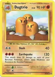Dugtrio (Japanese: ダグトリオ Dugtrio) is a Fighting-type Stage 1 Pokémon card. It is part of the Evolutions expansion.