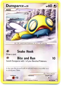 Dunsparce (Japanese: ノコッチ Nokocchi) is a Colorless-type Basic Pokémon card. It was first released as part of the Mysterious Treasures expansion.