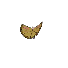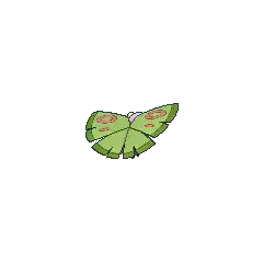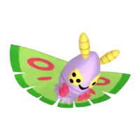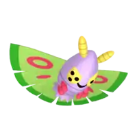 Dustox is a moth-like Pokémon with two pairs of wings. It has a purple, egg-shaped body with a jagged fringe on its rear. Its tattered, green wings are wide and flat, forming a disc-shape around its body. They have red markings in the form of rings and streaks, a darker green line around the edges, and contain toxic dust. This Pokémon has two pairs of red, stubby legs and yellow, stylized compound eyes. There is a pair of fuzzy, yellow antennae on top of Dustox's head, which are smaller on the female. These antennae are used to seek food. Dustox is nocturnal and is instinctively drawn to light. Swarms are attracted by the bright light of cities where they wreak havoc by stripping the leaves off roadside trees for food. It lives in forests.