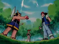 Meanwhile, Pidgeotto swoops and defeats Weedle, but, just as Ash is about to toss a Poké Ball, Samurai arrives and asks him if he is from Pallet Town. When Ash affirms it, Samurai draws his sword at him, with Misty barely yelling out a warning to Ash, and challenges Ash to a Pokémon battle. The wild Weedle escapes and Ash reprimands Samurai for causing him to lose the Weedle. However, Samurai says that Ash allowed it to escape. The two then begin their Pokémon battle.