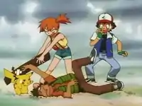 • Also in that same scene, Brock mistakenly said "To be continued" instead of saying to see the episode. This is the reason why Misty hit Brock with a log later.