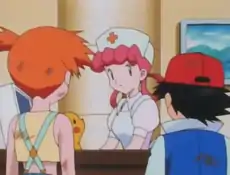 - In one of the Pokémon Center shots, Misty's suspenders are shown as light blue instead of red.