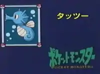 Misty spots an injured Horsea in the water as she, Ash, and Brock wait for the next boat to the mainland. The Horsea seems to be communicating a warning, painting an image with its ink, but Misty doesn't understand it and tries to catch it. Before she catches the Horsea, however, there is an explosion and a boat is destroyed. Misty immediately sends her Water-type Pokémon – Staryu, Starmie, and Goldeen – to rescue the sailors that have been flung into the ocean. Brock grabs a nearby boat and heads out to assist in the rescue effort. The sailors are paralyzed and mumble about what caused their ship to explode.