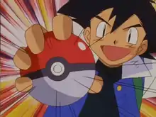- The writing on the Poké Ball in the advertisement is spelled "POCKEMON LEAG". This was not corrected in the dub, possibly as it is hard to read anyway. This misspelling of "Pokémon" as "Pockemon" is likely due to the fact that at the time of this episode's production (1997) there were no concrete plans for Pokémon's appearance to be international, and thus no standard romanization. Compare: ポケモン/ポケットモンスター (Pokémon/Pocketto Monsutā).