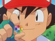 - Ash earns the Rainbow Badge from Erika as a thanks for saving her Gloom from the fire.