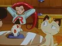 Outside, they find the Team Rocket posing as Egg sellers. The three have a whole basketful of Eggs that look just like Ash's mysterious Egg. Team Rocket tries to talk them into trading or buying one of their Eggs and when the group politely refuses, Jessie and James resort to throwing all of their fake Eggs in the air. The real Egg, that Brock was holding, gets stolen by Meowth in the confusion caused by the multitude of lookalikes. They recite their motto, though they realize Ash and his friends are too focused on finding their Egg. Team Rocket runs out of sight, escaping with the real Egg, leaving Ash, Misty, and Brock with the fakes. Later, in a small shack, James is set on eating the Egg, though Meowth decides to take care of it. He sleeps with it, sings to it, eats with it, and guards it from anything he feels is a threat.