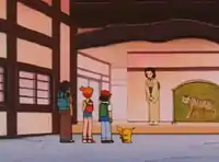 Later that night, as Ash and his friends mull over the riddle in the hot springs, Togepi wanders off from Misty and jumps on a Gyarados tap fixture. It unwittingly activates a secret switch that moves a boulder, exposing a cave and knocking down the hot springs' gender separation screen. After quickly getting their clothes back on, Ash and his friends explore the secret cave and find a metal door that is hot to the touch. Beyond the door, they find Blaine's secret Gym, suspended over the Cinnabar Island volcano. The local suddenly appears, revealing himself to be Blaine, who accepts Ash's challenge.