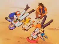 Team Rocket celebrates their successful escape over drinks, but they soon get into an argument over the credit for the capture. Jessie and James force Meowth out of the conflict, claiming that a Pokémon cannot own another Pokémon. James resorts to kicking Meowth away, though he hits the sub's wall, which disturbs Jigglypuff, and it also begins to fill with water. The unusual noise coming out of Blastoise's shell puts the trio to sleep as the sub begins to sink. Fortunately, the Squirtle and Wartortle arrive on the scene and bring the sub to the island.