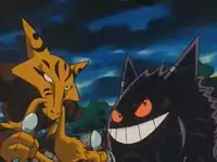 Gengar chases Ash, Misty, and Brock back to the van, where Eve is possessed by the two strange artifacts (the one that looks like a spoon and the other one with the same design), and the spoon sticks in the other one like a key, and the spell on Eve and the other artifacts is broken. The two artifacts then transform into a giant Alakazam, also with strange markings on it. Gengar and Alakazam battle. Alakazam shoots energy waves that, when they hit the ground or a wall, transform into strangely-shaped stones. What those are is unknown. Gengar and Alakazam enter a beam struggle with Night Shade and Psybeam respectively, and where the beams collide, they shoot into the sky, threatening to destroy the entire planet.