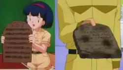 - A stone tablet very similar to the one that Eve deciphers appears almost exactly four years later in A Ruin with a View. It shows up in the possession of Professor Alden, who learns from it the way to get into the stone chamber of the Oldale Ruins.