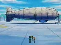 Ash and the others reach the blimp yard and see a broken-down blimp. Two men approach them and warn that the blimp is haunted. Jessie and James, disguised as an air-hostess and pilot, respectively, push the engineers out of the way, and push the group on board. Jigglypuff appears and notices a lever that resembles a microphone. As it jumps to sing into it, it unexpectedly causes the ballast water to be released, and the blimp begins to soar into the sky. Jigglypuff finds its foot tangled in some rope and is also carried off.