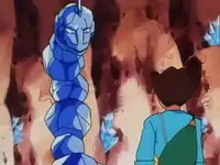 At the end of the cave, they come across a lake. Marill dives in and then, followed by the Crystal Onix. Mateo calls on his Cloyster, thinking it has the type advantage. However, its Water Gun attacks prove to be useless. The Crystal Onix retaliates and knocks Cloyster out with one headbutt. Just then, Team Rocket shows up, having freed themselves from their traps. Jessie and James send out Arbok and Victreebel in an attempt to catch the Crystal Onix, while Ash and Misty send out Pikachu and Staryu to counterattack. Staryu and Pikachu attack Team Rocket, then the Crystal Onix smacks them into a blastoff.