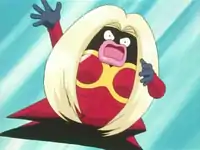 Suddenly, Team Rocket arrives and asks Prima for a CD recording of her lecture. She replies that it is on tape only, and whispers to Ash and his friends that it is $18.95, shocking Team Rocket before they say their motto. Misty correctly guesses that their original plan was to steal Prima's Pokémon, but they tell her that they decided to go after Pikachu, figuring they would lose against Prima. Ash gets ready to fight, but Prima tells him that she will take care of it. She immediately sends out Jynx, who uses Ice Punch and freezes Team Rocket. Jynx then uses Blizzard and blows them into the sky. The pieces from the ice block rain down, making sparkles in the sky.
