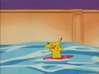 - Pikachu can be seen riding his famous pink surfboard in one of the scenes.