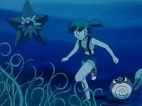 At the same time, Misty, having unsuccessfully searched several lakes for the Salveyo weed, encounters Poliwag. Poliwag warms up to Misty just as James and Meowth appear. James and Meowth demand the Poliwag, but Misty, seeing that Poliwag is hiding behind her, refuses. Seeing that Misty is outnumbered, James and Meowth proposition a battle, which Misty accepts. However, the battle does not go well for Team Rocket, with Goldeen evading Victreebel's Razor Leaf before striking it with a Horn Attack, and then repeatedly juggling it with Fury Attack, forcing James to recall it. Then, Staryu cuts through Weezing's Smog with Double-Edge and defeats it. Next, Meowth claws Psyduck's face, then tries to bite its head, causing it to unleash a headache-induced Confusion that sends both it and James blasting off. Misty, who had managed to ask for Poliwag's help, walks away with Poliwag in tow.