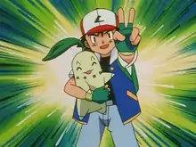 The next day, the snowstorm stops, and Ash, Pikachu, and Chikorita try make it back to the Pokémon Center. However, they are intercepted by Team Rocket, who is using a snowball-firing machine. Chikorita uses Razor Leaf on the snowballs the trio throws, then, under Ash's orders, she Vine Whips the machine, causing it to go out of control. While Team Rocket is distracted, Ash orders a Thunderbolt from Pikachu, which causes the machine to explode, sending Team Rocket blasting off again. Ash, Pikachu, and Chikorita are then reunited with Brock, Misty, and Nurse Joy. The group returns to the Pokémon Center, and Ash and his friends prepare to hit the road again. However, Chikorita follows the group as they begin to depart and waves her scent in Ash's face. Nurse Joy explains that she wants to come along, and Ash happily accepts his newest Pokémon.