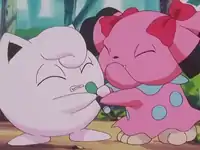 Meanwhile, Ash and his friends are just beginning their day. Ash sits by the campsite's river to wash his face, while Brock stretches with Pineco and Misty scolds her Psyduck for its habit of putting its hands on its head. Brock asks Pineco if it's ready to have some fun, and Pineco promptly explodes in Brock’s arms. Ash notices a Snubbull walk by, and he instantly notices its red ribbons. Misty says that it's obviously the Snubbull that belongs to Madame Muchmoney. As the group wonder why she has run away from home, Snubbull rushes off. Ash and his friends pursue Snubbull, but soon lose her only to find themselves face-to-face with a familiar Jigglypuff. Before the group can flee, Jigglypuff jumps onto a tree stump and performs a Singing rendition which causes Ash and his friends to fall asleep. Team Rocket, who have disguised themselves as shrubs, and Snubbull, who was about to bite onto Meowth's tail, are also lulled to sleep.