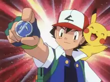 - Ash defeats Morty in a Gym battle and earns the Fog Badge.
