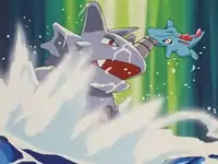 Pietra is keen to battle Rhydon, but it makes the ground shake with three powerful stomps before rushing off. As Rhydon dives into the lake, Ash sends out Totodile to pursue it. Pietra calls on her Marill, and Misty's Water-types also join the search party. Pietra loads everyone else onto her speed boat, and they sail into the lake. However, the search is not going too well until Totodile bumps into a strange object while performing a backstroke, and it instinctively clamps onto it. Rhydon rises from the water and spins its horn to throw Totodile off. The remaining Water Pokémon surround Rhydon, but Rhydon flees once again. The fleet of Water-types catch up to Rhydon but are then caught up in a whirlpool whipped by Rhydon spinning its horn underwater. The group's Pokémon are soon defeated and float to the surface, forcing Pietra and the others to return to the shore. As the group considers their next plan, Misty spots Rhydon walking onto a nearby lake island. Brock's binoculars reveal that the island also has a large supply of apples.