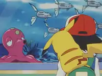 Overnight, Team Rocket slips into Marcellus's home through a window. Jessie is initially startled by the school of Remoraid because they remind her of her first grade teacher, but James helps her settle down. Meowth suggests that they could open a fishing park and make money for people to catch the Remoraid. With that, the trio commences their plan and vacuums up all the Remoraid. Meanwhile, the group and Marcellus are having dinner when they hear a funny noise. Marcellus decides to check it out. He flips on the light switch and he is greeted by Team Rocket who perform their motto. Marcellus demands to know what they want, then he turns to see that his tanks are empty. Ash and his friends peer through the doorway just as Team Rocket leave through a window. The group and Marcellus rush outside to see Team Rocket leave in their truck. Before the trio drives off, Octillery walks over and clings to the truck's bottom. Octillery leaves a trail of ink behind for Marcellus to follow. Team Rocket stops at a port to load their stolen goods onto a waiting boat. Meowth takes the controls of the crane, but he is stopped by Octillery who suctions itself to his face. Jessie and James attempt to pull Octillery off, but they get headbutted by Octillery's hard head. Octillery soon breaks open the tank containing all of Marcellus’s Remoraid and frees them into the nearby ocean. Now the group has arrived on the scene, but Team Rocket isn't giving up. Meowth tries to grab Octillery with the crane, making a few unsuccessful moves but finally getting it. Ash is about to have Pikachu use Thunderbolt, but Meowth laughs and warns that octillery will be hit as well. With no other option, the Remoraid all fire at the crane, causing Octillery to go flying. But the Remoraid save it with their Water Gun jets, placing it gently onto the port. Marcellus is thrilled to see that his Remoraid have finally recognized Octillery as their friend. Pikachu then unleashes a Thunderbolt followed by Octillery shooting an Octazooka, blowing Team Rocket sky high. After the battle, the Remoraid soon evolve into Octillery themselves and it looks like Marcellus's Octillery won't be lonely anymore.