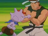 The group emerges from a cave and spots a sitting Pokémon wearing a neckerchief. Ash checks his Pokédex, which identifies the mystery Pokémon as a Tyrogue. Brock tries to give him some food, but the Tyrogue refuses the offer. As Brock checks his bag for more food, the Tyrogue swipes three containers of food and runs off with them. It sends out a call for help, and a storm of chestnuts rains down on the group. Tyrogue makes his escape while his friends, a Mankey and Primeape, leap out of a nearby tree. The Tyrogue tosses the food to them and they all climb up a cliff. Bayleef is called out to assist, but her Vine Whip causes a rockslide. Just seconds away from getting squashed, a man followed by a Hitmonchan and Hitmonlee destroy the boulder. The trio of Fighting-types flee the scene.