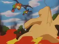 Team Rocket huddles at Ash's feet, thanking him for saving them; and Kaburagi takes the opportunity to retrieve the Dragon Fang from James. Clair begs Dragonite to recognize her and stop her attack but to no avail. Dragonite fires a Hyper Beam at her, which is only partially deflected by Charizard's Flamethrower. Although Clair is unharmed, Kaburagi finally realizes why the Pokémon is so unreasonable; he warns Clair that Dragonite is suffering from attack rage. As the guardian of the Holy Land unleashes a powerful Whirlwind that forces Dragonair to dispel its rain clouds, Misty asks Clair about Kaburagi's statement. The Blackthorn Gym Leader explains that Dragonite has become confused after performing too many consecutive attacks, causing her to attack everything she sees in a berserk fury.