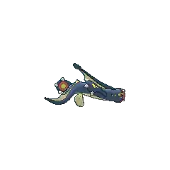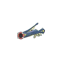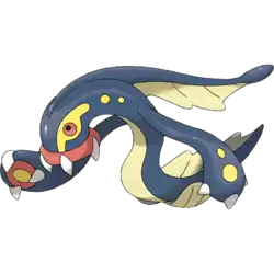 Eelektross is an eel-like Pokémon that resembles a lamprey, with a long tentacle-like, finned limb extending from its head. It has red eyes, a dark blue body, and possesses clawed, paddle-like arms with yellow spots and yellow-and-red palms. It has a beige fin on the upper portion of its body and beige fin-like legs below. It lives in the ocean, but it comes ashore to capture prey. It can use its arms to crawl out of the ocean and its sucker mouth to suck in prey. After latching onto its prey using its sucker mouth, it drags the prey into the ocean. It electrifies prey before eating.