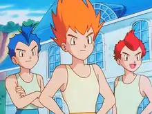 Pyro (Japanese: アツシ Atsushi) has red hair styled to look like flames. His signature Pokémon is Flareon. He boasts it is the best because of the powerful flames of Fire Spin.