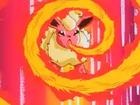 Later they found Team Rocket from the ink trail left by Misty's Horsea, and were able to free them all except for Eevee. Using its Fire Spin, Flareon set the are alight. Though Team Rocket were unfazed, with James's Weezing defeating it. Mikey and his Eevee went on to send Team Rocket blasting off. Later, Pyro and Flareon posed for a group photo to commemorate Mikey's decision to become an Eevee Trainer. Flareon's only known move is Fire Spin. | ||