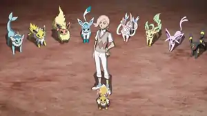 Virgil owns an Eevee and every one of its then-known final forms. They debuted together in Team Eevee and the Pokémon Rescue Squad! where he used them in his mountain rescue duties. He also used them to fight through the Vertress Conference, which he won.