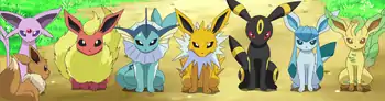 An Eeveelution (Japanese: イーブイズ EVs[1]) is a term used for the current group of eight Pokémon that evolve from Eevee. It is a portmanteau of the words "Eevee" and "evolution". Its definition may be extended to include Eevee itself. It originally was an unofficial term used by fans, but the term eventually passed into the realm of official usage first as a pun in the official guide of Pokémon Stadium 2,[2] and then later in the TCG Theme Deck Eeveelution, as well as in the game Pokémon Ranger: Shadows of Almia.