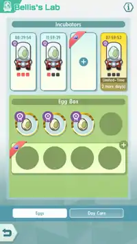 Up to four Eggs can be incubated at a time in Bellis's lab with only one incubator being unlocked for free at the beginning. An additional incubator can be purchased for 300 paid gems. By purchasing the Eggcelerator Pass, which costs 500 paid gems, the player gets 14-day access to the third incubator and an auto-incubate feature. The fourth incubator is only available during Egg events (for 14 days), but it's always free. Plus, if the third/fourth incubator would disappear but it still holds an egg, then that incubator will stay until that egg hatches instead.