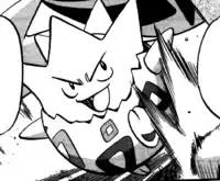 Since hatching from his Egg, Togebo picked up some of Gold's habits such as gambling. He is a very naughty and stubborn Pokémon, and is often seen with a sulk on his face. As described by DJ Mary, Gold and Togebo are so alike they may as well be twins. Despite being newly hatched, Togebo was easily able to defeat opponents more experienced such as Gligar and Tyranitar, but also fainted in the process as for the latter. In the HeartGold & SoulSilver chapter, Togebo felt like that it was not fully connected with Gold, as stated by Lance one point. During the fight with Arceus, Gold has Togebo fight Arceus, finally realizing what happened, which caused Togebo to evolve into Togetic and then Togekiss with a Shiny Stone.