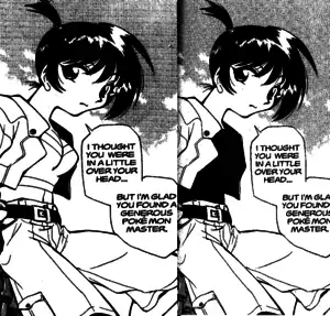 While much of the revealing clothing in this chapter was edited out before its release in English, further differences occur between the English monthly and collected volume releases. In this release, Misty is wearing the same white top as in the Japanese version as well as in Pikachu, I See You! - a white top revealing some cleavage. In the collected volume, however, her top is re-drawn as a black top with no cleavage revealed.