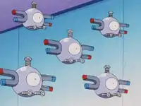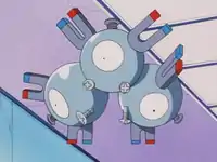 | Magneton appeared after the ten Magnemite cornered Ash and his Chikorita. Magneton then searched for the two when they escaped. It was put to sleep by Jigglypuff's Sing.