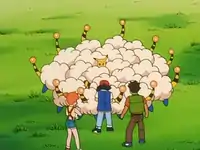 | Ellen has many Mareep which live on Ellen's ranch. They first appeared when they suddenly crowded Ash's Pikachu. Pikachu launched a Thunder Shock, making the Mareep's coats go fluffy. Ellen's Raichu then showed up stop them. They were then rounded up by Ash, Pikachu and Raichu. That night, they were taken up to the mountain so they could absorb electricity to make their coats look beautiful. Suddenly, Team Rocket attacked and captured all of the Mareep in a net, but Raichu was able to get them free.